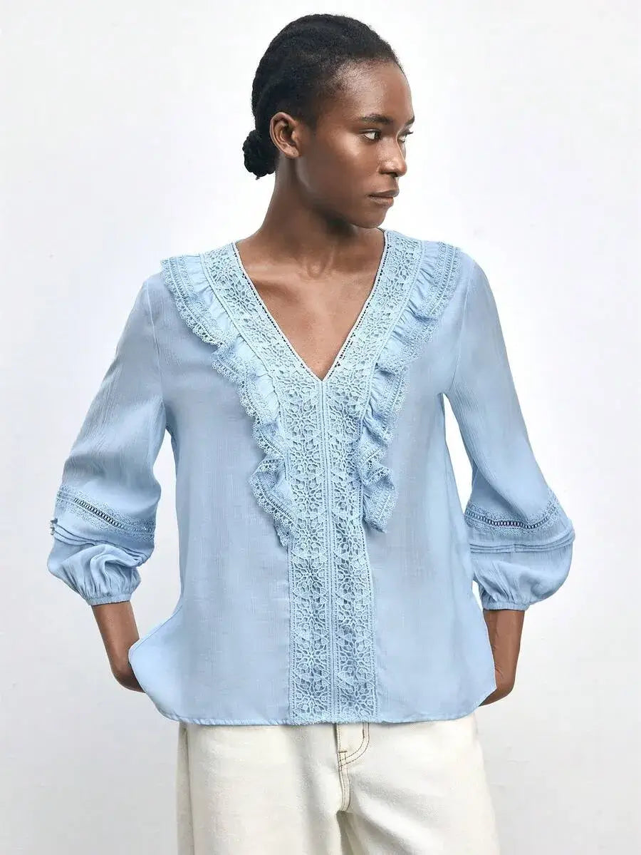 Blusa casual holgada de mujer con encaje